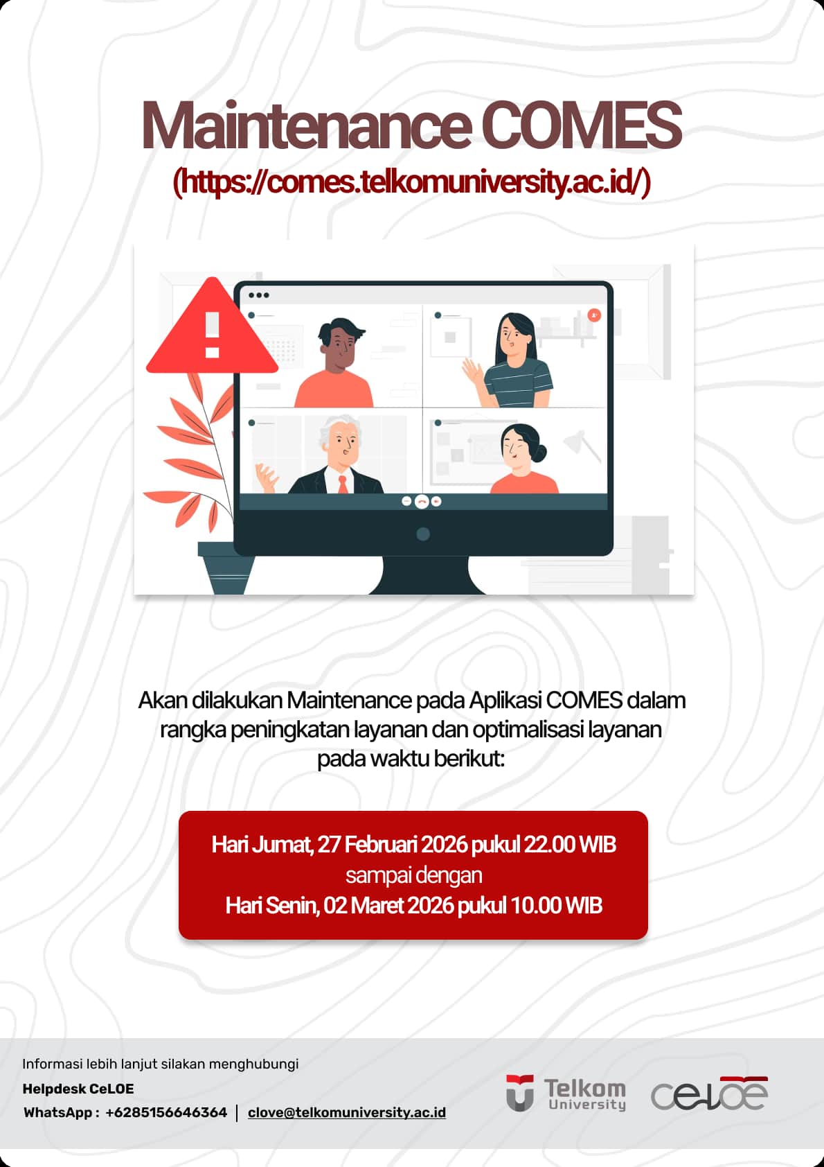 Salam HEI,Dear Telutizen,Dalam rangka rangka peningkatan layanan dan optimalisasi layanan aplikasi COMES (https://comes.telkomuniversity.ac.id/) akan dilakukan Maintenance pada rentang waktu berikut:Hari Jumat, 27 Februari 2026 pukul 22.00 WIBsampai denganHari Senin, 02 Maret 2026 pukul 10.00 WIBDemikian informasi ini kami sampaikan. Atas perhatian dan kerja samanya, kami ucapkan terima kasih.Hormat kami,CeLOE Telkom University
