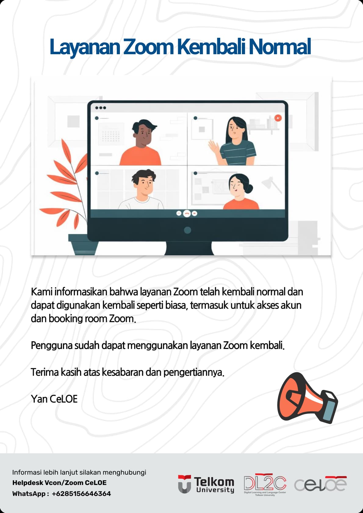 Sehubungan dengan permasalahan akun Zoom yang terjadi pada hari Jumat 27 Maret 2026 pukul 09.45 yang menyebabkan kesulitan akses dan booking room Zoom, kami dari unit Yan CeLOE memohon maaf sebesar-besarnya atas gangguan ini.