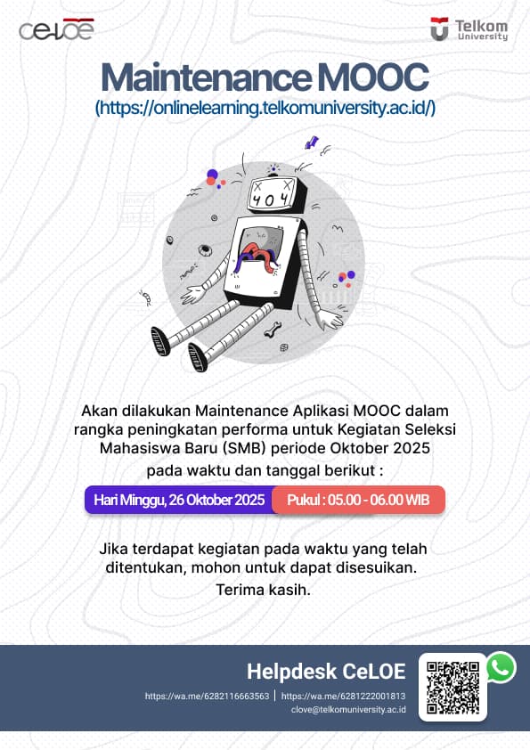 Salam HEI,Dear Telutizen,Akan dilakukan Maintenance Aplikasi MOOC (onlinelearning.telkomuniversity.ac.id) yang bertujuan untuk meningkatkan