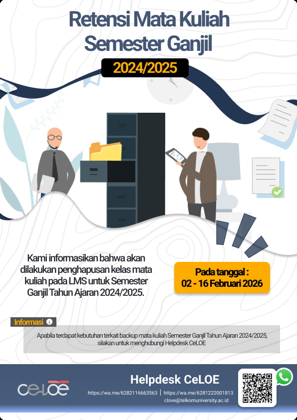 Dear Telutizen,Dalam rangka persiapan perkuliahan semester ganjil 2023/2024, akan dilakukan Maintenance pada Platform Pembelajaran CeLOE Telkom Univer