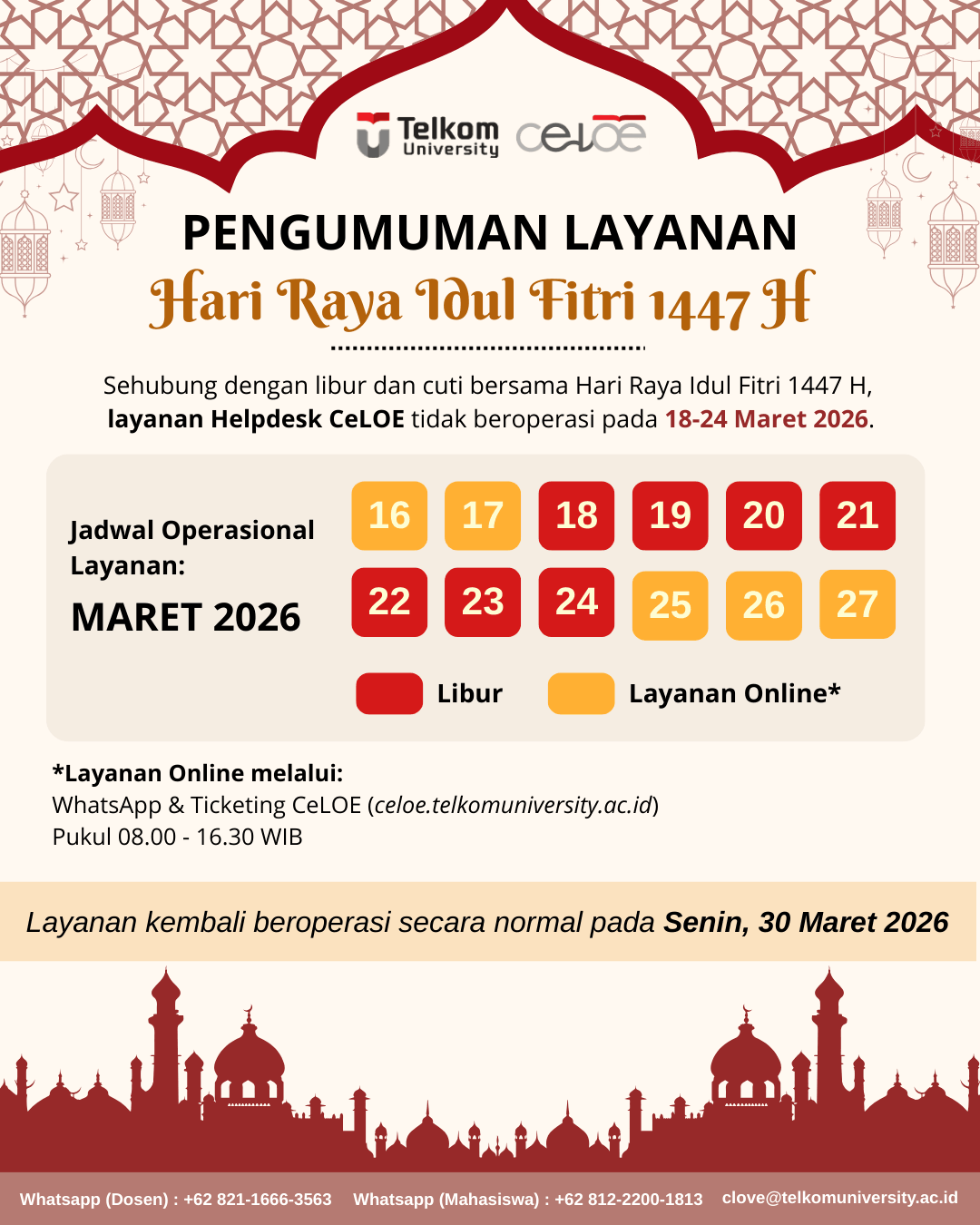 Sehubungan dengan libur dan cuti bersama dalam rangka Hari Raya Idul Fitri 1447 H, layanan Helpdesk CeLOE Telkom University tidak beroperasi pada 18–24 Maret 2026.Pada periode operasional layanan, pengguna dapat mengakses layanan online melalui: WhatsApp Helpdesk Sistem Ticketing CeLOE: celoe.telkomuniversity.ac.id Layanan online tersedia pada pukul 08.00 – 16.30 WIB.Layanan Helpdesk CeLOE akan kembali beroperasi secara normal pada Senin, 30 Maret 2026. Terima kasih atas perhatian dan pengertiannya.Hormat kami,CeLOE Telkom University